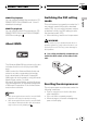 Section 13 Initial Settings 2 Press MULTI-CONTROL to turn AUX on. AUX :ON appears in the display. # To turn AUX off, press MULTI-CONTROL again. Switching the dimmer setting To prevent the display from being too bright at night, the display is automatically dimmed when the car s headlights are turned on. You can turn the dimmer on or off. 1 Use MULTI-CONTROL to select DIM. The function name tag DIM is highlighted. 2 Press MULTI-CONTROL to turn dimmer on. Dimmer :ON appears in the display.
