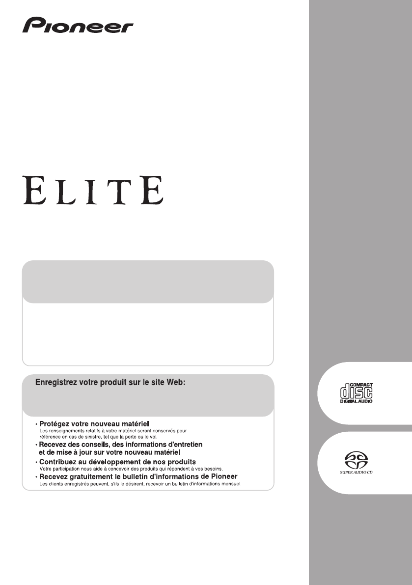 PD-D9MK2_en_CUXJ.book 1 ページ 2009年4月3日 金曜日 午後8時52分 D9 PD-D9MK2-K Super Audio CD Player PD-D9MK2-K Lecteur Super Audio CD Register your product on: http://www.pioneerelectronics.com (US) http://www.pioneerelectronics.ca (Canada) • Protect your new investment The details of your purchase will be on file for reference in the event of an insurance claim such as loss or theft.