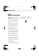 01_before_start.fm 7 ページ 2009年4月14日 火曜日 午後1時9分 Before you start Inserting the battery Please confirm that the following accessories are in the box when you open it. English What’s in the box 01 • Remote control Français • AAA/IEC R03 dry cell batteries x2 • RCA audio cable (red/white plugs) • SR control cable • Power cable • Operating instructions (This document) Caution Incorrect use of batteries may result in such hazards as leakage and bursting.