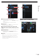 DECK screen (CD/USB mode) (MIDI mode) 1 2 3 1 3 4 5 6 7 1 Display of currently playing track’s information/ channel switching button ! ! [HOT CUE/SAMPLER] In the CD/USB mode The music file’s information is displayed here. In the MIDI mode The channel switches each time the button is tapped. 2 Needle search pad The sound at a certain position can be played easily by touching your finger to the needle search pad at that position.