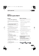 XV-DV88.book 9 ページ 2006年11月9日 木曜日 午後2時28分 Before you start • This system cannot record CD-R or CD-RW discs. • Unfinalized CD-R/RW discs recorded as CD Audio can be played, but the full Table of Contents (playing time, etc.) will not be displayed. DVD-R/RW compatibility • Compatible formats: DVD-Video, Video Recording (VR)* * Edit points may not play exactly as edited; screen may go momentarily blank at edited points.