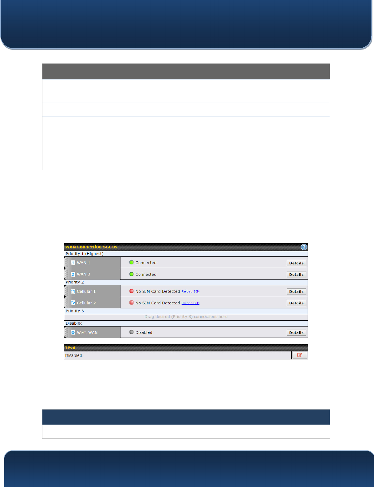 Pepwave MAX and Surf User Manual 8.41 WAN Connection Priority WAN Connection Priority If your device supports it, you can specify the priority of WAN connections to be used for making VPN connections. WAN connections set to OFF will never be used. Only available WAN connections with the highest priority will be used. To enable asymmetric connections, connection mapping to remote WANs, cut-off latency, and packet loss suspension time, click the button.