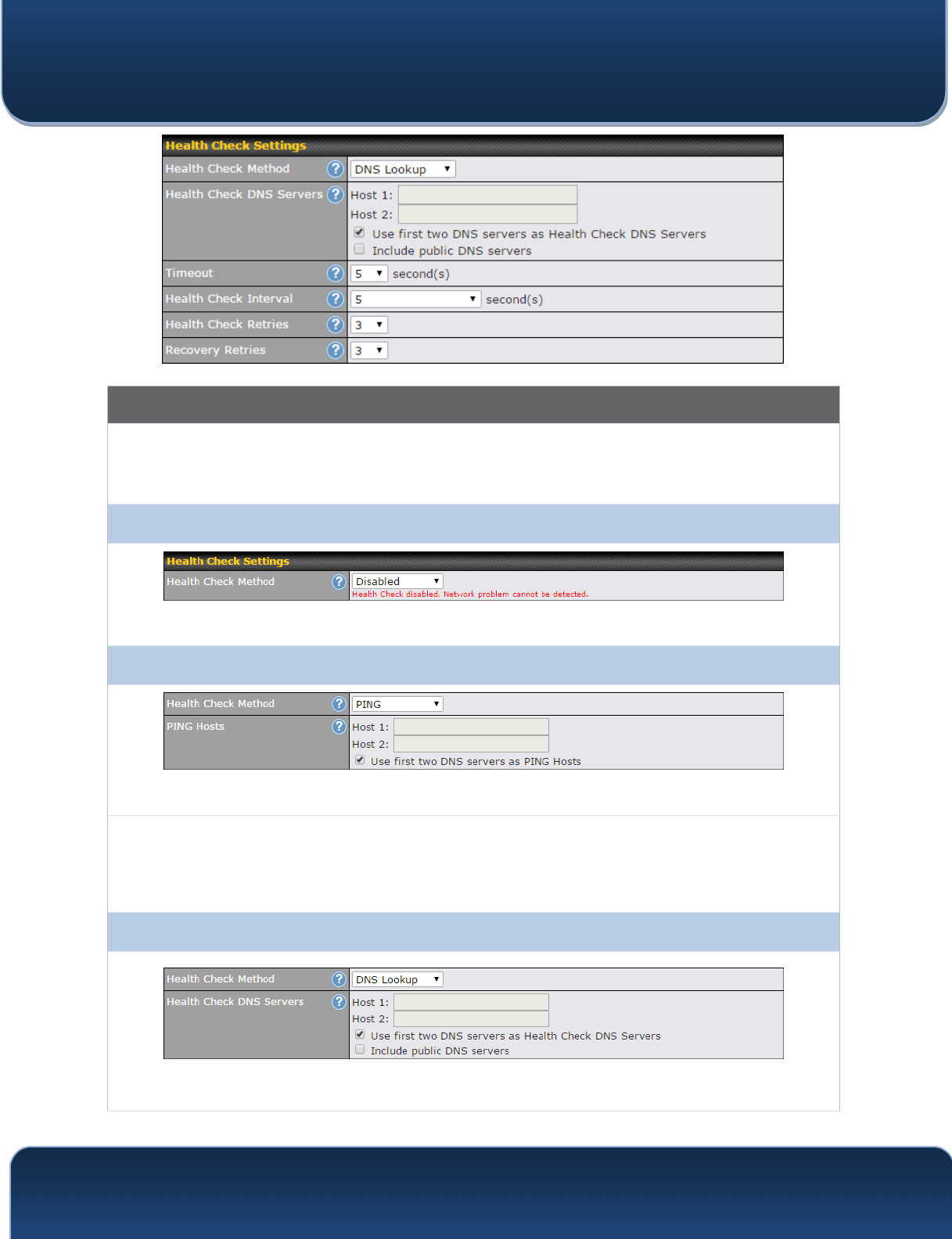 configured as Disabled, PING, DNS Lookup, or HTTP. The default method is DNS