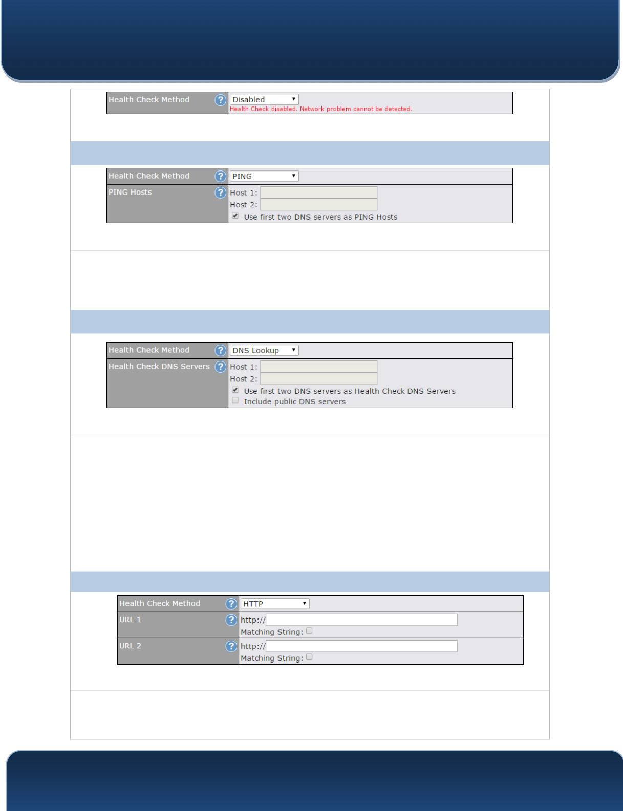 When Disabled is chosen in the Method field, the WAN connection will always be considered as up. The