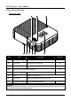 DLP® Projector – User’s Manual Bottom view Item Label Description See page: 1. Ceiling support holes Contact your dealer for information on mounting the projector on a ceiling. 2. Height adjuster button Push to release height adjuster 3. Height adjuster Adjuster drops down when adjuster button is pushed 4. Tilt adjuster Adjust angle of the picture Note: When installing, ensure that you use only UL Listed ceiling mounts.