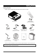 Getting Started Packing Checklist Carefully unpack the projector and check that the following items are included: DLP® projector Remote control (with two AAA batteries) Power cord USB cable (USB type A-to-B USB) Composite video cable (RCA 3-to-RCA 3) Computer cable (VGA-VGA) Audio cable (mini jack-to-mini jack) CD-ROM (This User’s manual) Users Guide Carrying case Contact your dealer immediately if any items are missing, appear damaged, or if the unit does not work.