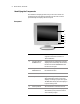2 Model VSS15X / VSS15X-TR Identifying the Components The VitalScreen S display provides easy access to all controls and peripheral ports. The following illustrations of the front and back panels identify the display controls and ports. Front panel 1 2 3 4 5 6 7 1 LCD screen A 15-inch diagonal AMLCD. The screen supports a maximum resolution of 1024 x 768 (XGA). 2 Function UP and DOWN buttons Vertical arrows to navigate the onscreen display menu horizontally. UP selects the functions to the left.
