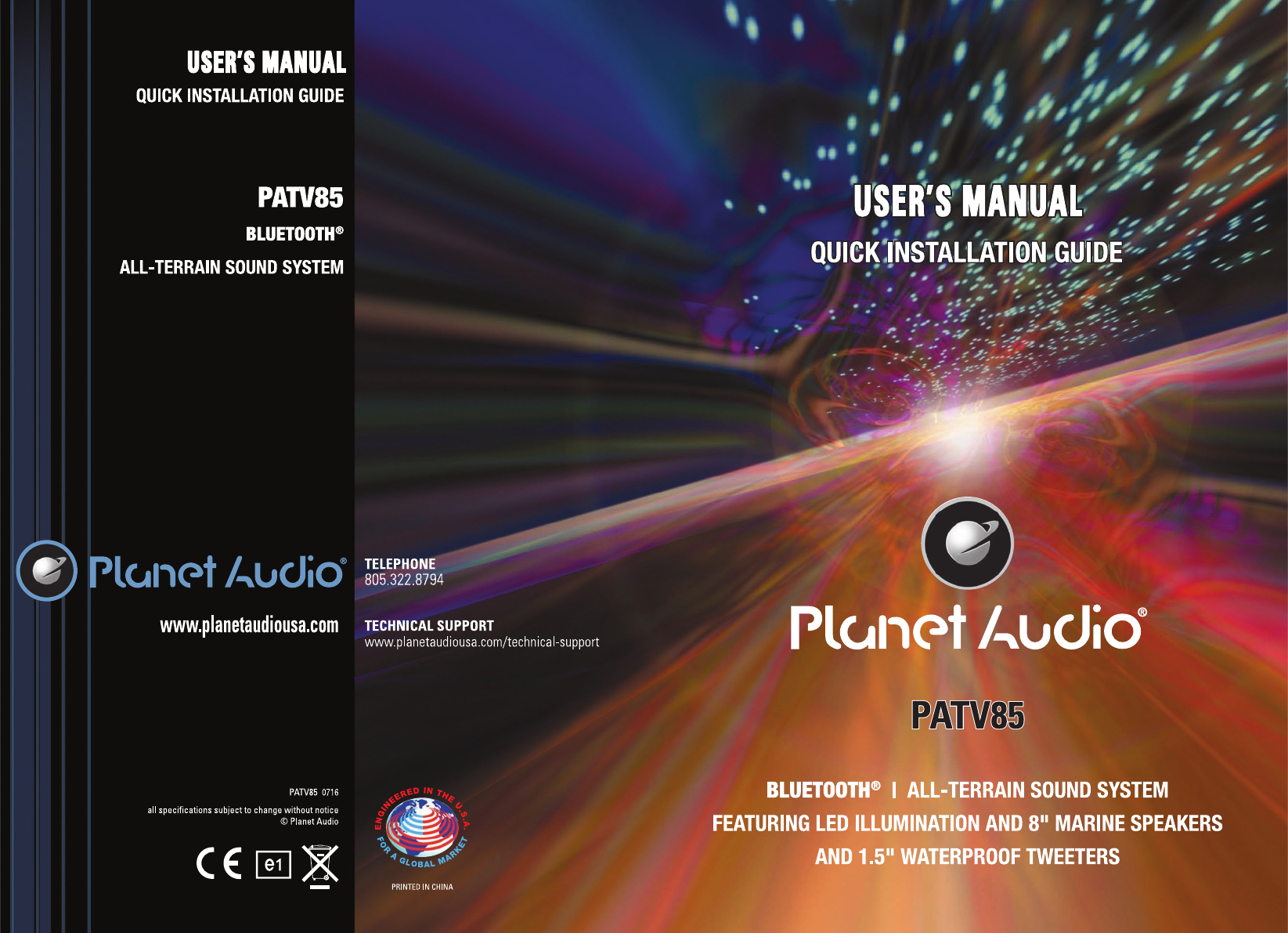 USER MANUAL QUICK INSTALLATION GUIDE PATV85 BLUETOOTH® ENABLED ALL-TERRAIN SOUND SYSTEM USER MANUAL QUICK INSTALLATION GUIDE www.planetaudiousa.com/technical-support Flat Subwoofer Flat Subwoofer PATV85 PX12 BLUETOOTH® ENABLED ALL-TERRAIN SOUND SYSTEM PX12 2012 2012 iPod / iPhone are trademarks of Apple Inc. registered in the U.S. and other countries. PLANET AUDIO is not affiliated with Apple Inc. Specifications subject to change without prior notice. 815 VER:1.0 EN PATV85-UM-FINALv1.0.