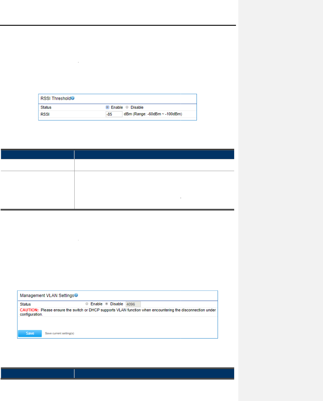 specific RSSI, the AP will encourage client to access the nearby AP with stronger signal, thus ensure stable