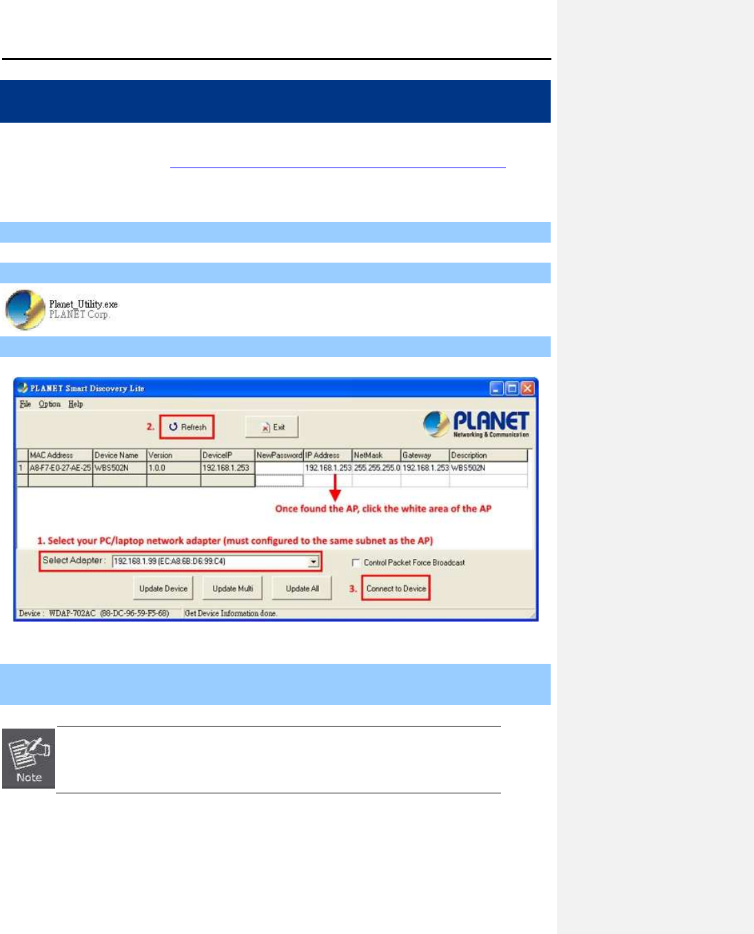 To easily discover the WBS-502AC in your Ethernet environment, the Planet Smart Discovery Utility is an ideal
