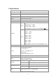 1.4 Specification Standard IEEE 802.11b, IEEE 802.11g Signal Type DSSS (Direct Sequence Spread Spectrum) Modulation BPSK / QPSK / CCK / OFDM Port 10/100Base-TX (RJ-45) * 1 Antenna Detachable Dipole Antenna * 1 Antenna Connector Reversed Polarity SMA Male Output Power 17dBm 11 Mbps (CCK): -82dBm 5.5 Mbps (QPSK): - 86dBm 802.11b 1, 2 Mbps (BPSK): - 90dBm (typically @PER < 8% packet size 1024 and @25ºC + 5ºC) 54 Mbps: -72dBm 48 Mbps: - 72dBm Sensitivity 36 Mbps: -76dBm 24 Mbps: -79dBm 802.