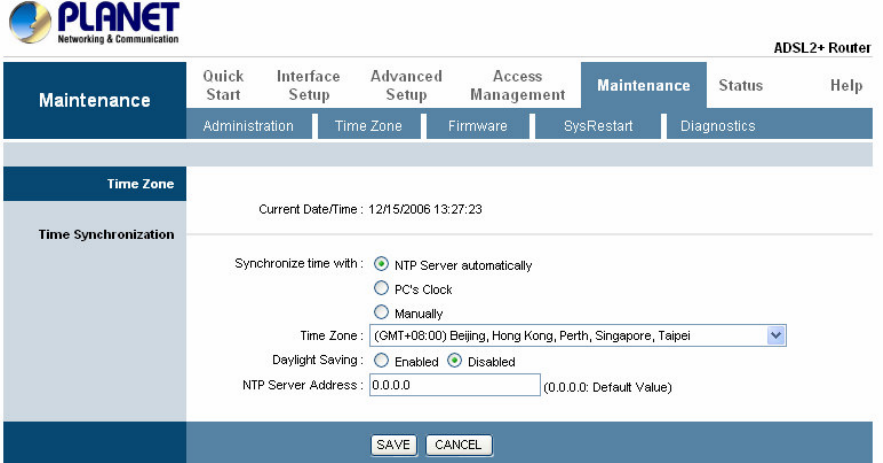Synchronize time with: You can choose “NTP Server automatically”, “PC’s