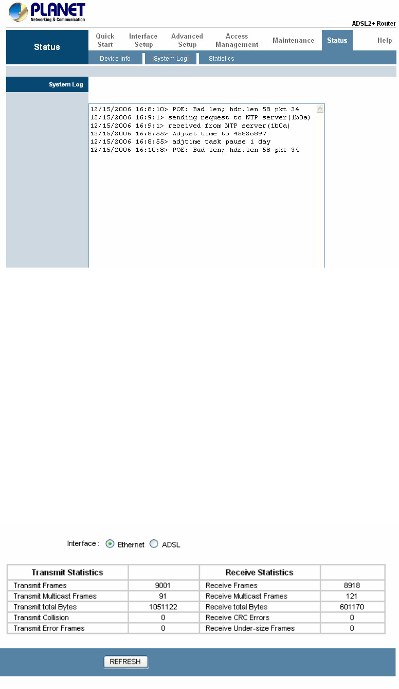 Ethernet/ADSL to view the statistics report of LAN/WAN.