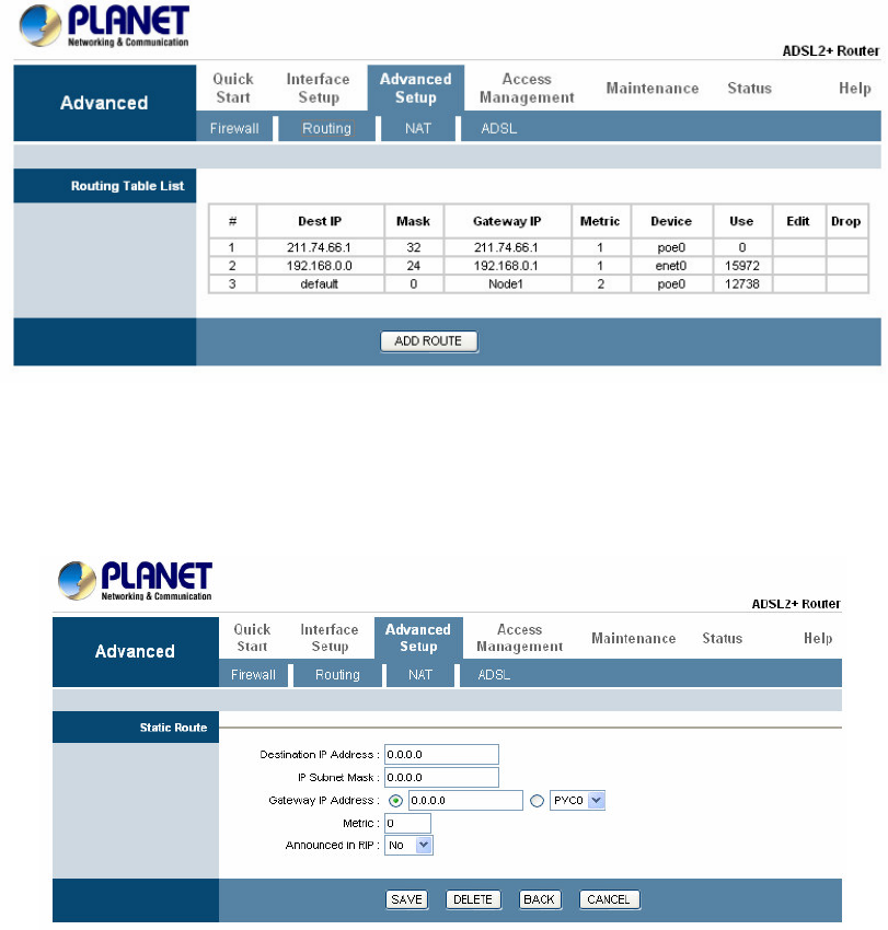 press ADD ROUTE to edit the static route. (As below screen)
