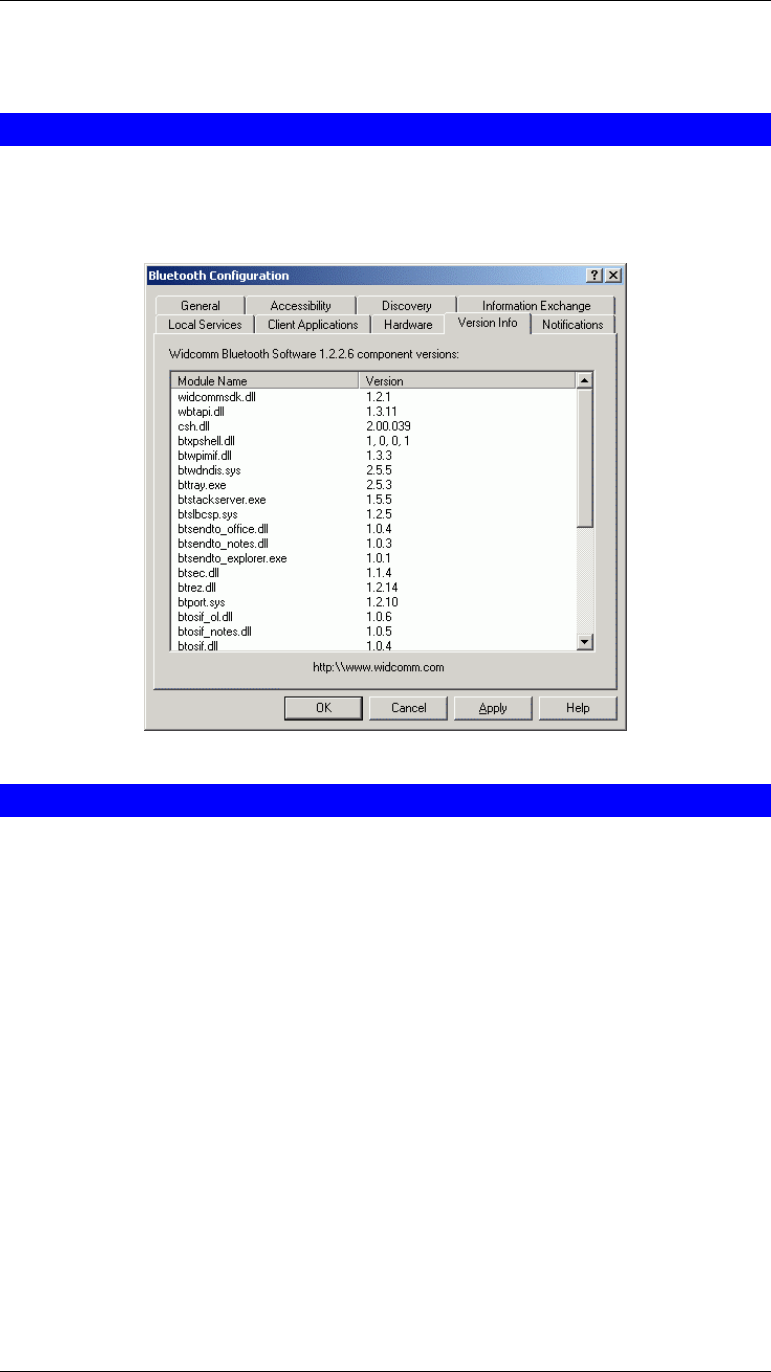 The Version Info tab of the Bluetooth Configuration Panel displays the name and
