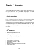 Table of Contents Chapter 1 1.1 1.2 1.3 1.4 1.5 Chapter2 2.1 Chapter3 3.1 Overview........................................................................................................ 5 Introduction ................................................................................................... 5 Features:......................................................................................................... 5 Application: .............................................................................
