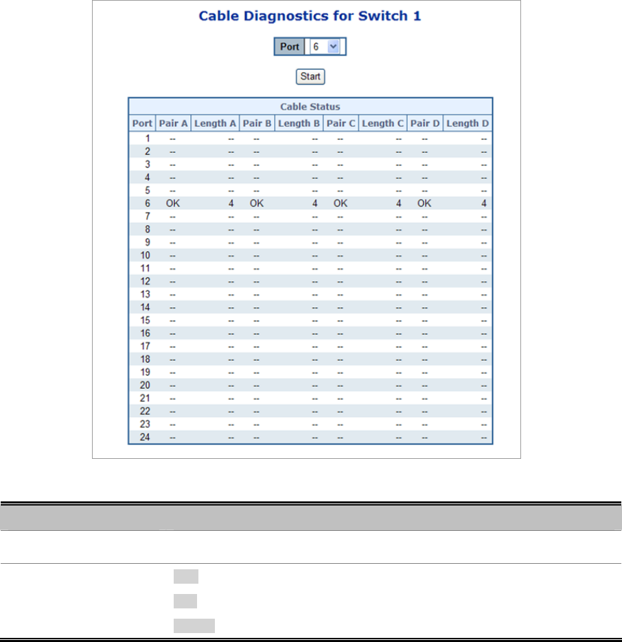 seconds. When completed, the page refreshes automatically, and you can view the cable diagnostics results in the cable status