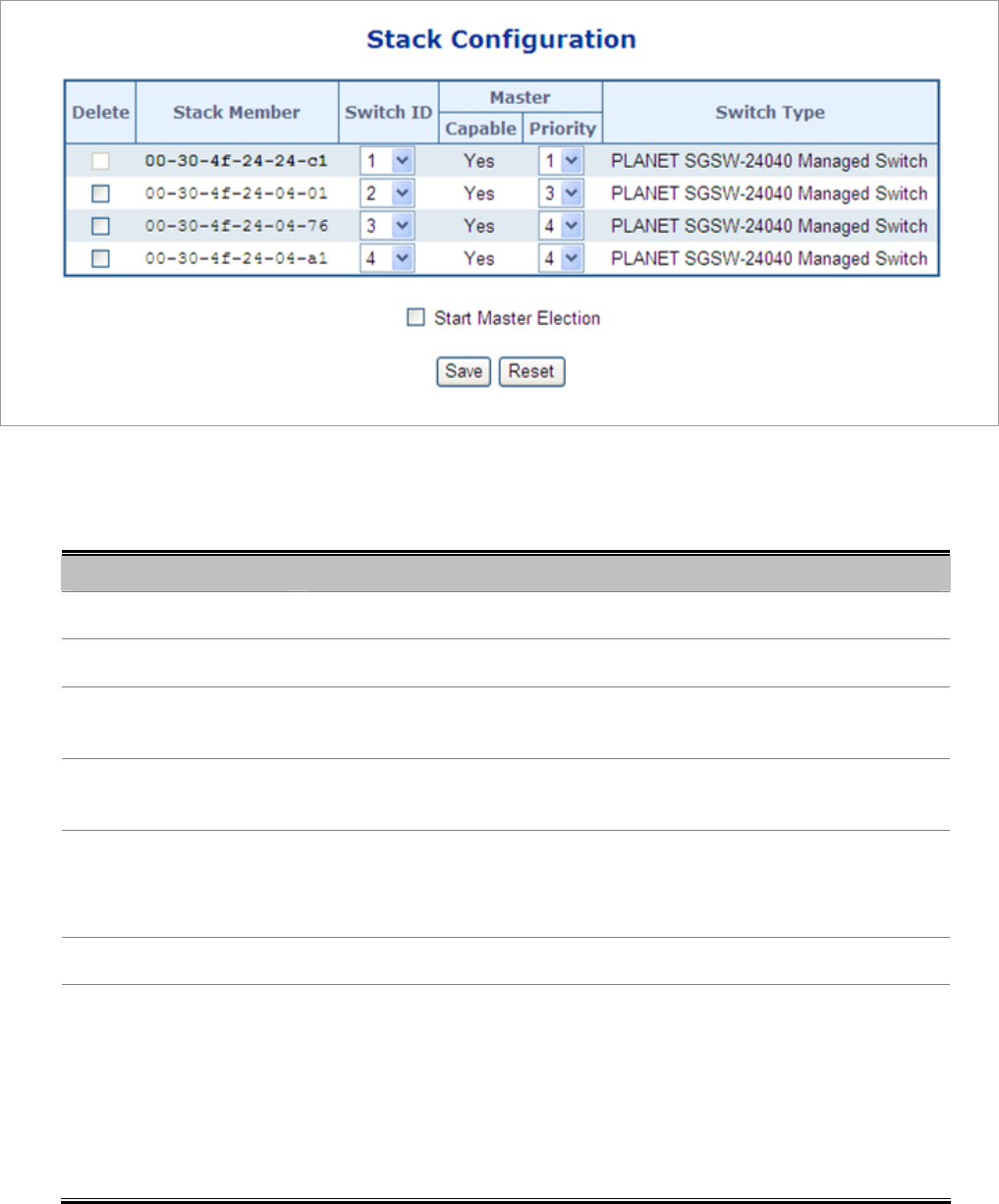 This page is used for configure the stack, include assign Switch ID, master priority and display the current stack member