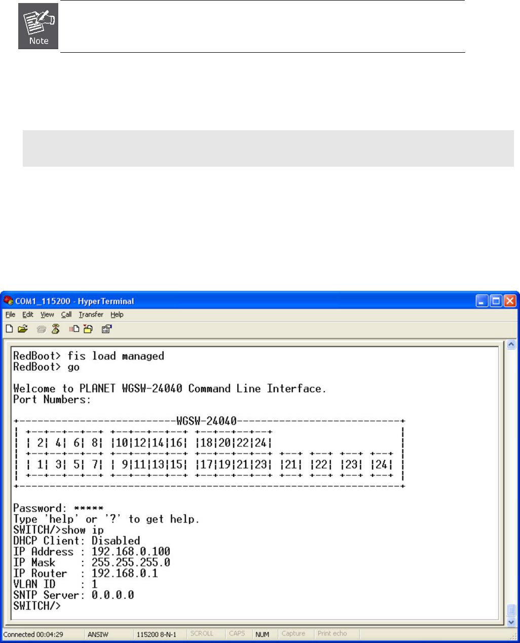1. On ”Switch/> ” prompt, enter “show ip”.