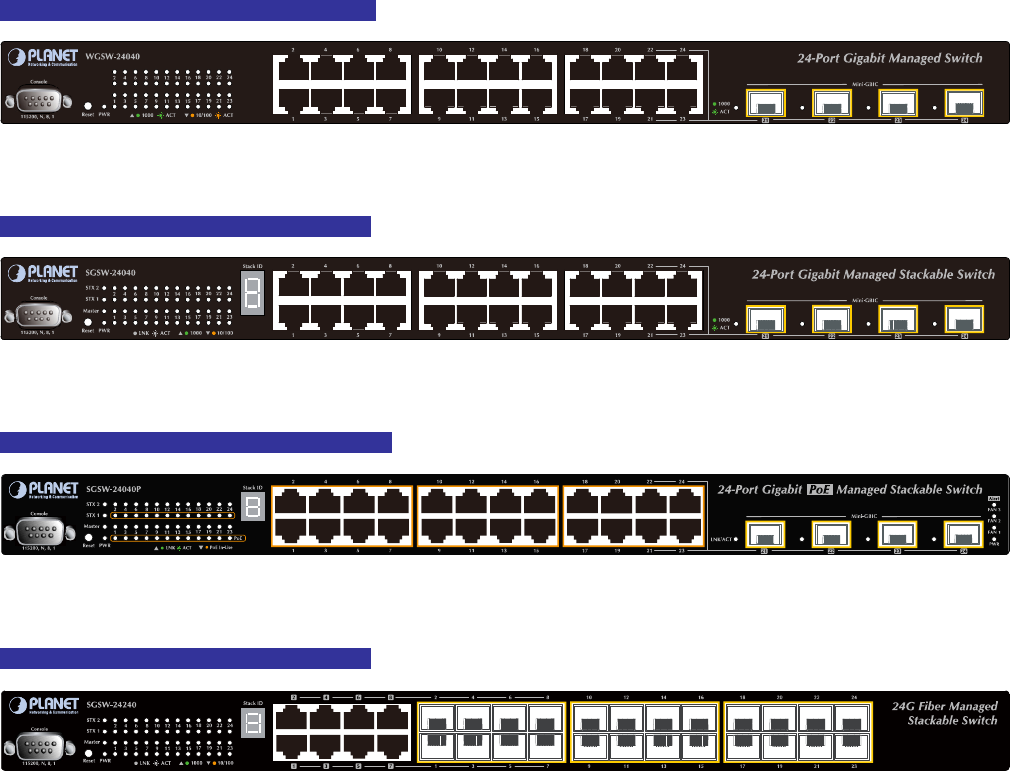The unit front panel provides a simple interface monitoring the switch. Figure 2-1 to 2-4 show the front panel of the Managed