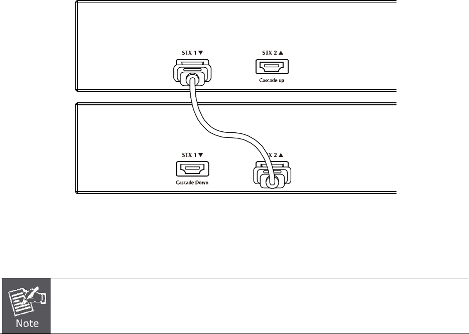 “STX1 / Cascade Down” on the bottom switch to the port marked “STX2 / Cascade Up” on the top switch of the stack.