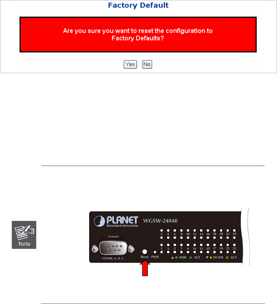 To reset the Managed Switch to the Factory default setting, you can also press the hardware