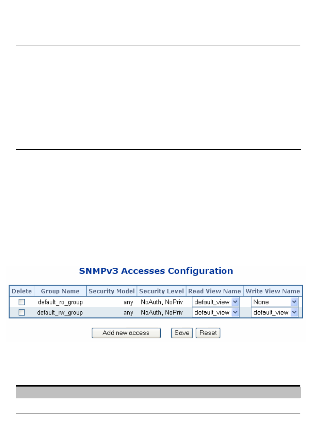 Configure SNMPv3 accesses table on this page. The entry index key are Group Name, Security Model and Security Level.