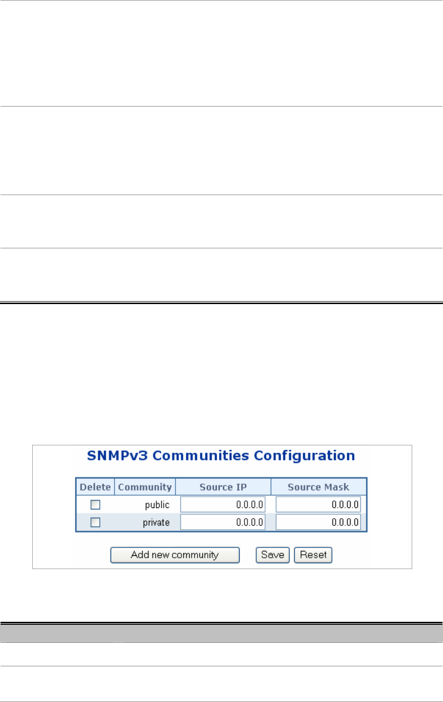 Configure SNMPv3 communities table on this page. The entry index key is Community.