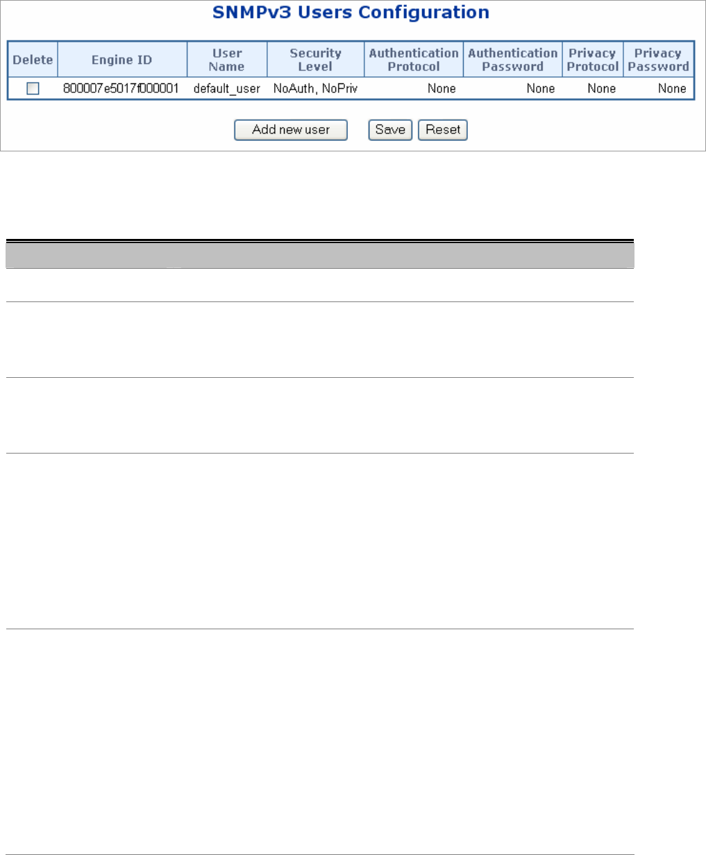 Configure SNMPv3 users table on this page. The entry index key are Engine ID and User Name.