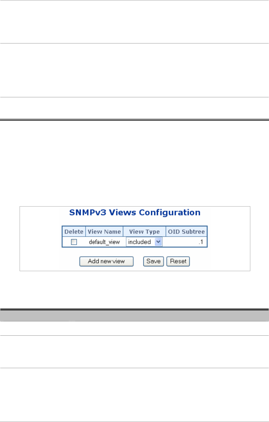 Configure SNMPv3 views table on this page. The entry index key are View Name and OID Subtree.