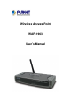 Chapter 1 Introduction Thank you for purchasing WAP-1963. This device is an access point for IEEE 802.11b 2.4GHz wireless network. You can use this access point to build up a wireless LAN, any wireless LAN station can join the wireless network. It has support 64/128-bit WEP (Wired Equivalent Privacy) Encryption and MAC address filter function to consolidate the wireless network security, you can prevent unauthorized wireless stations from accessing your wireless network.