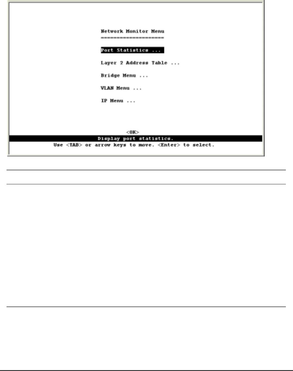 The Network Monitor Menu provides access to port statistics, address tables, STA information, VLANs