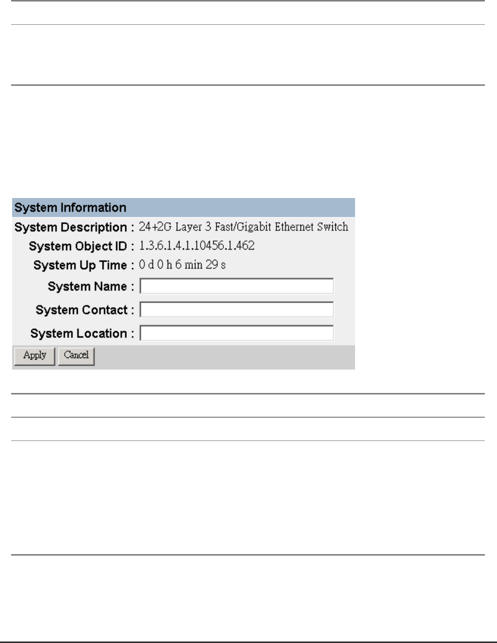 Use the System Information Menu to display a basic description of the switch, including contact