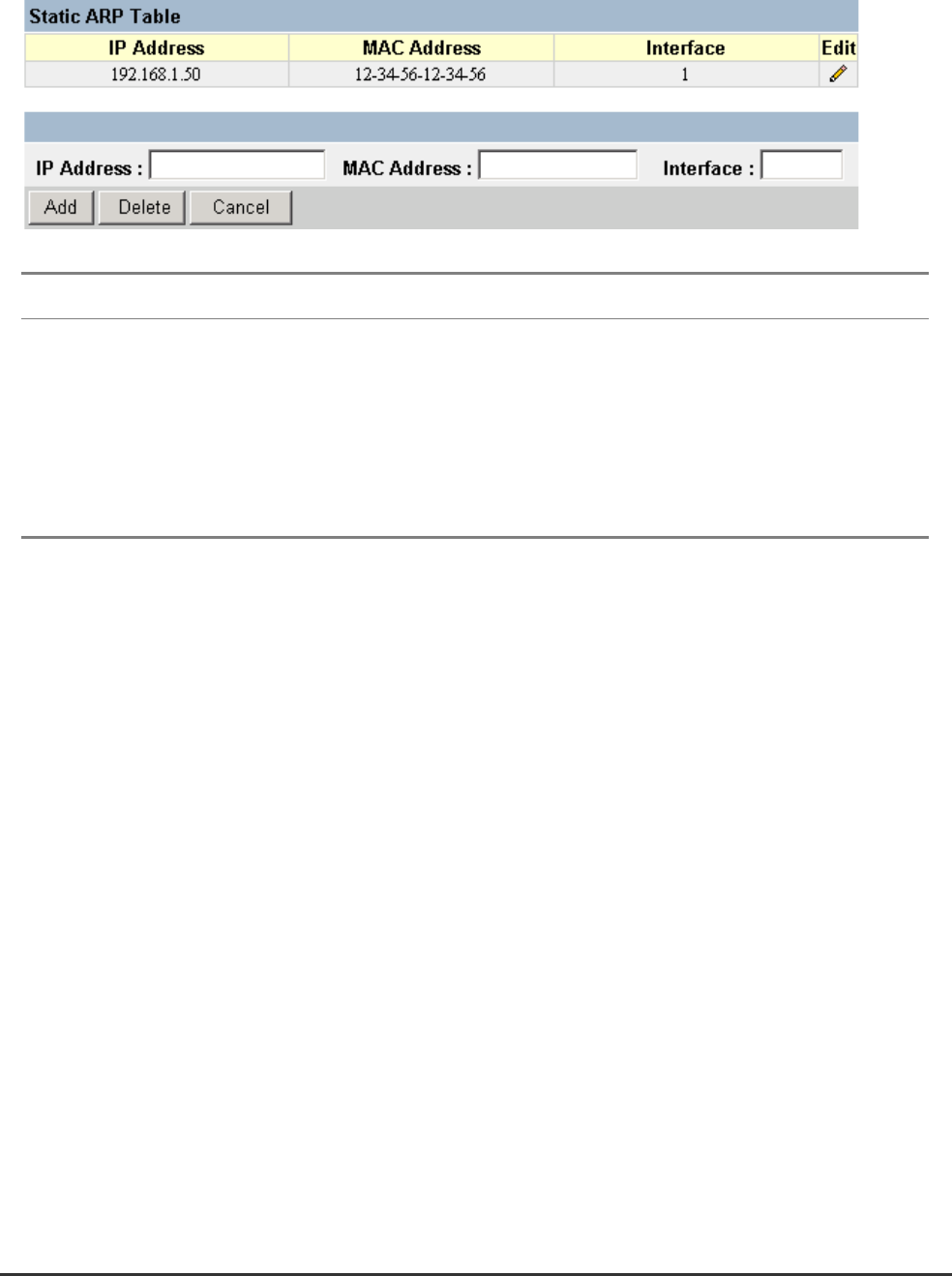 Use the following screen to display or edit entries in the Static ARP Table. Entries added to this table are