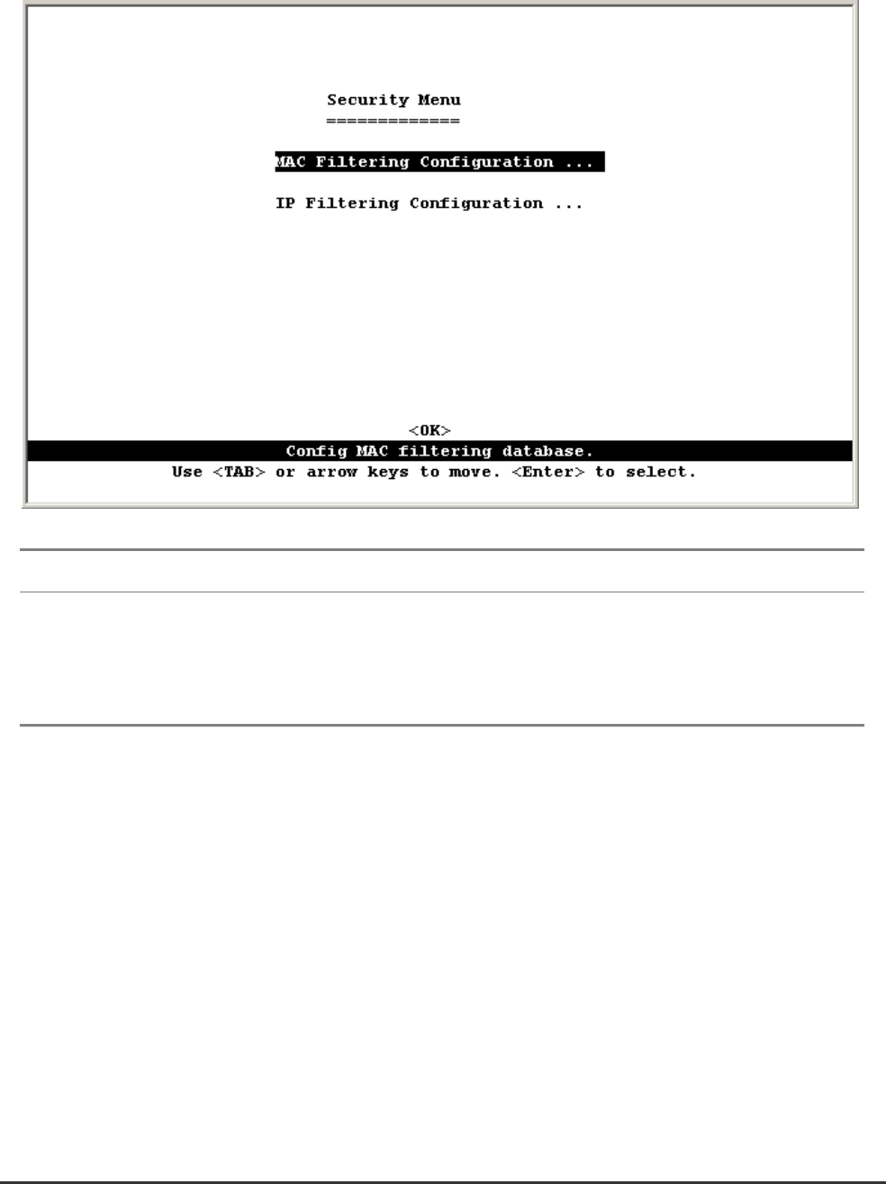 The Security menu contains options to filter specified MAC or IP addresses. These menu options are