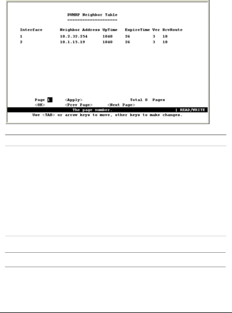 The DVMRP Neighbor Table contains the switch’s DVMRP neighbors, as discovered by receiving