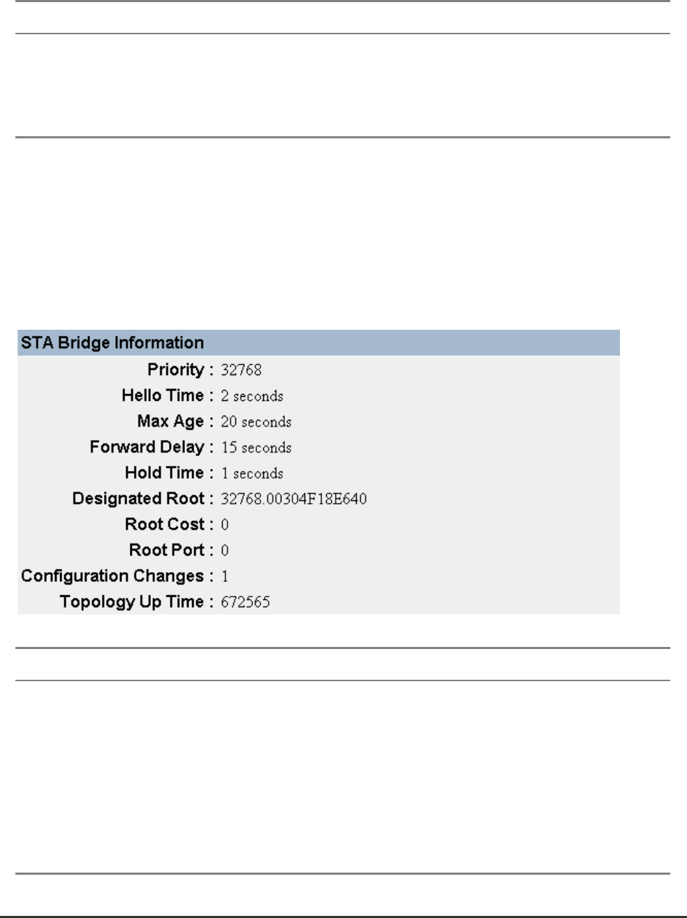 The Bridge menu is used to display settings for the Spanning Tree Algorithm. For a more detailed