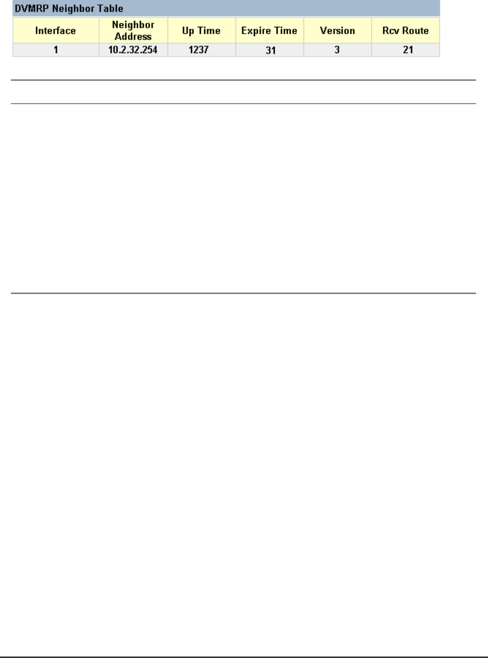 The DVMRP Neighbor Table contains the switch’s DVMRP neighbors, as discovered by receiving