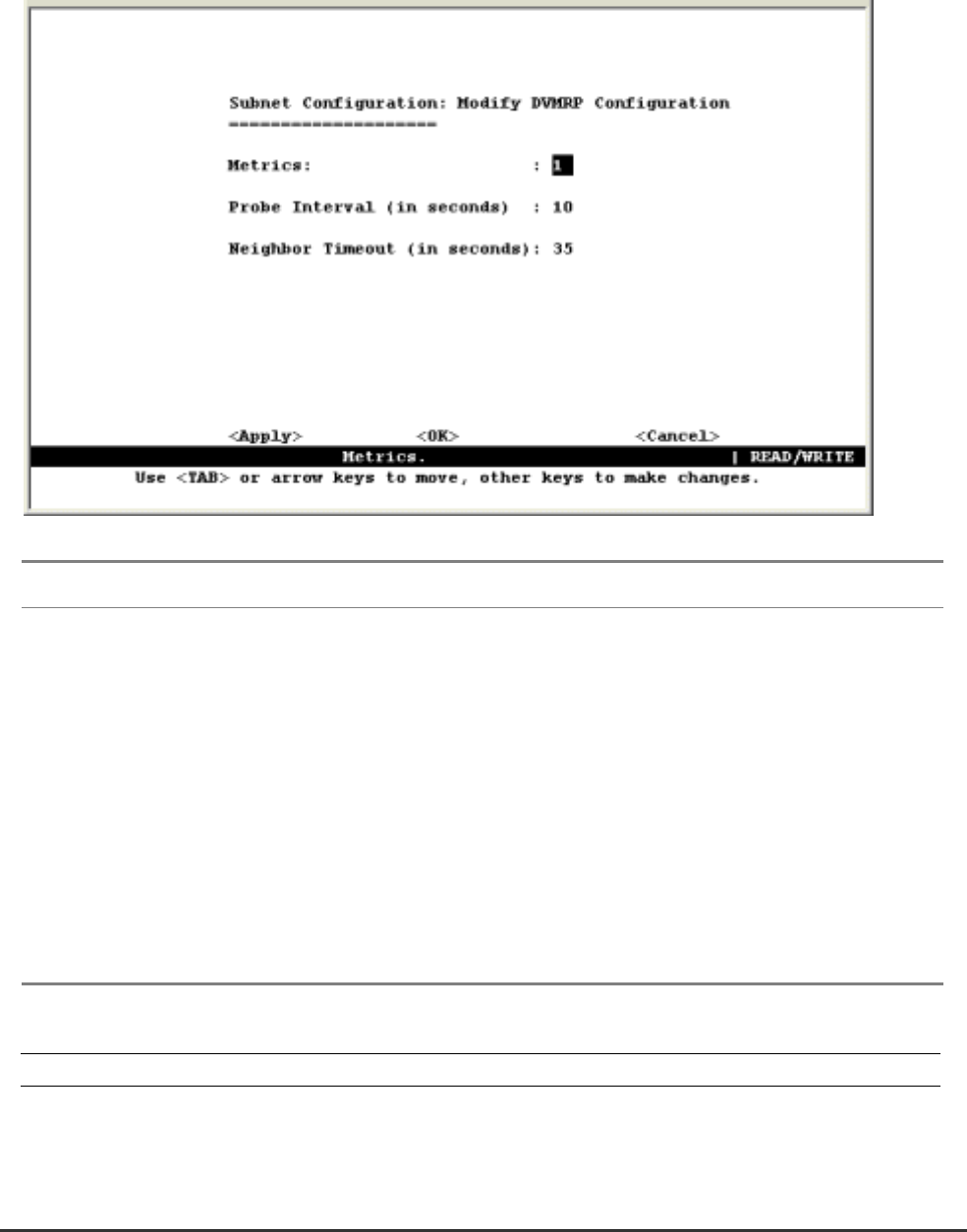 DVMRP, you must specify the routing metric, probe interval, and neighbor router timeout.