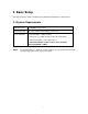 2. Basic Setup This chapter provides details of installing and configuring the wired/wireless IR IP Camera. 2.1 System Requirements Network Interface 10/100MBase-TX Ethernet Monitoring System Recommended for Internet Explorer 6.0 or later System Hardware · CPU: Pentium 4, 1.5GHz or above · Memory Size : 512 MB (512 MB or above Recommended ) · VGA card resolution : 1024 x 768 or above · Network bandwidth: In VGA resolution mode, minimum upload bandwidth is 1Mbps.