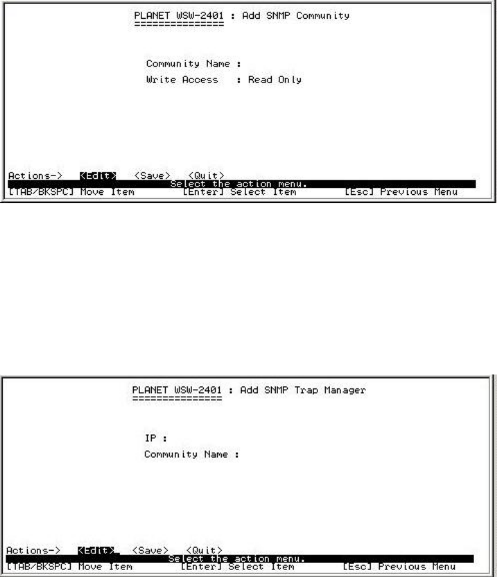 Ø Select “Add” to enter into “Add SNMP community” screen, then press Edit