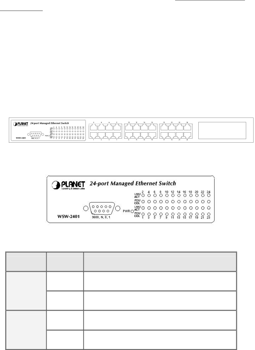 The font panel of the WSW-2401 Managed Ethernet Switch consist LED indicators, console