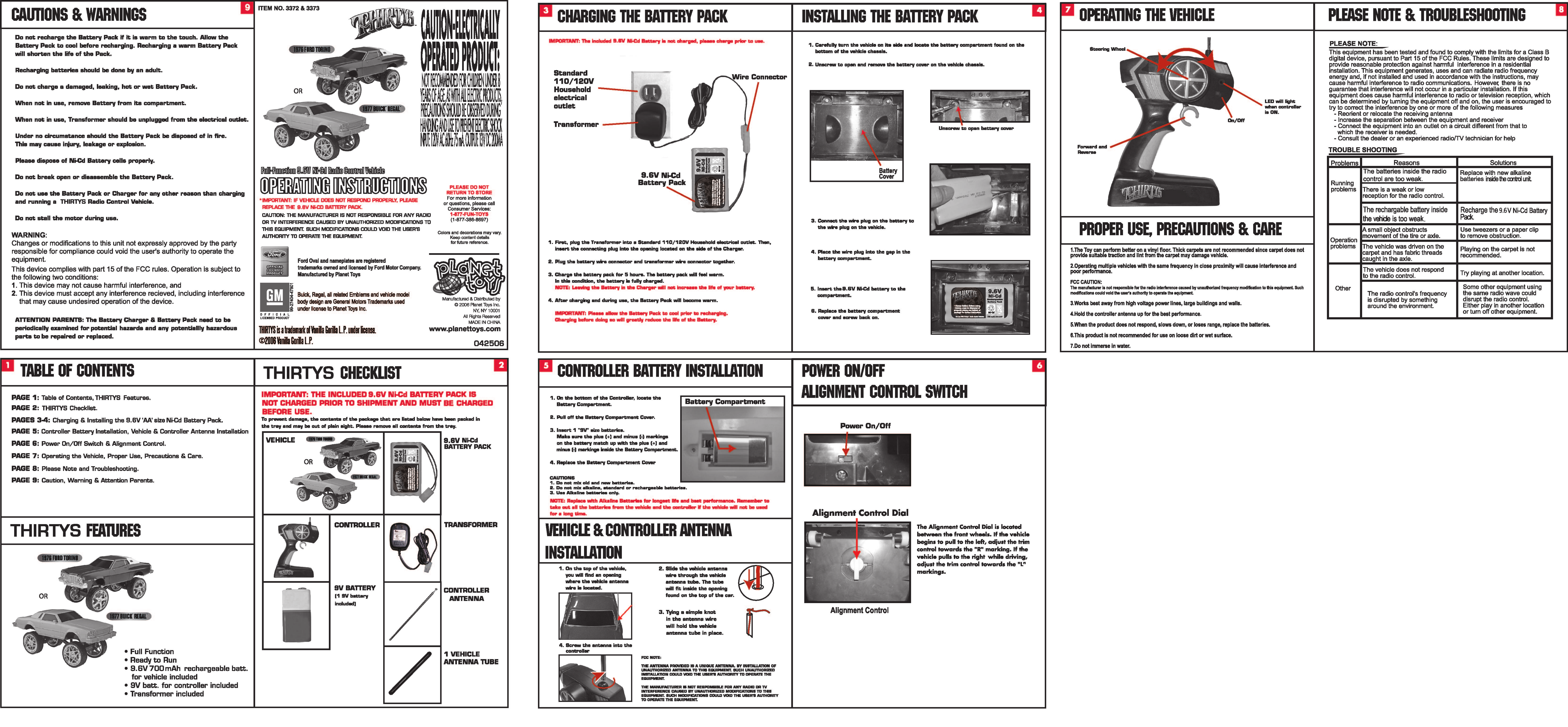 ITEM NO. 3372 & 3373 4 OPERATING THE VEHICLE PLEASE NOTE & TROUBLESHOOTING 1. Carefully turn the vehicle on its side and locate ths battery compartment found on the | PLEASE NOTE: bottom of the vehicle chassis. This equipment has been tested and found to comply with the limits for a Class B digital device, pursuant to Part 15 of the FCC Rules. These limits are designed to 2. Unscrew to pan and removes the battery cover on the vehicle chassis.