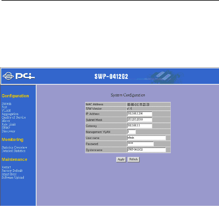 After successful log-in, the “SYSTEM Configuration” page appears (this is also the
