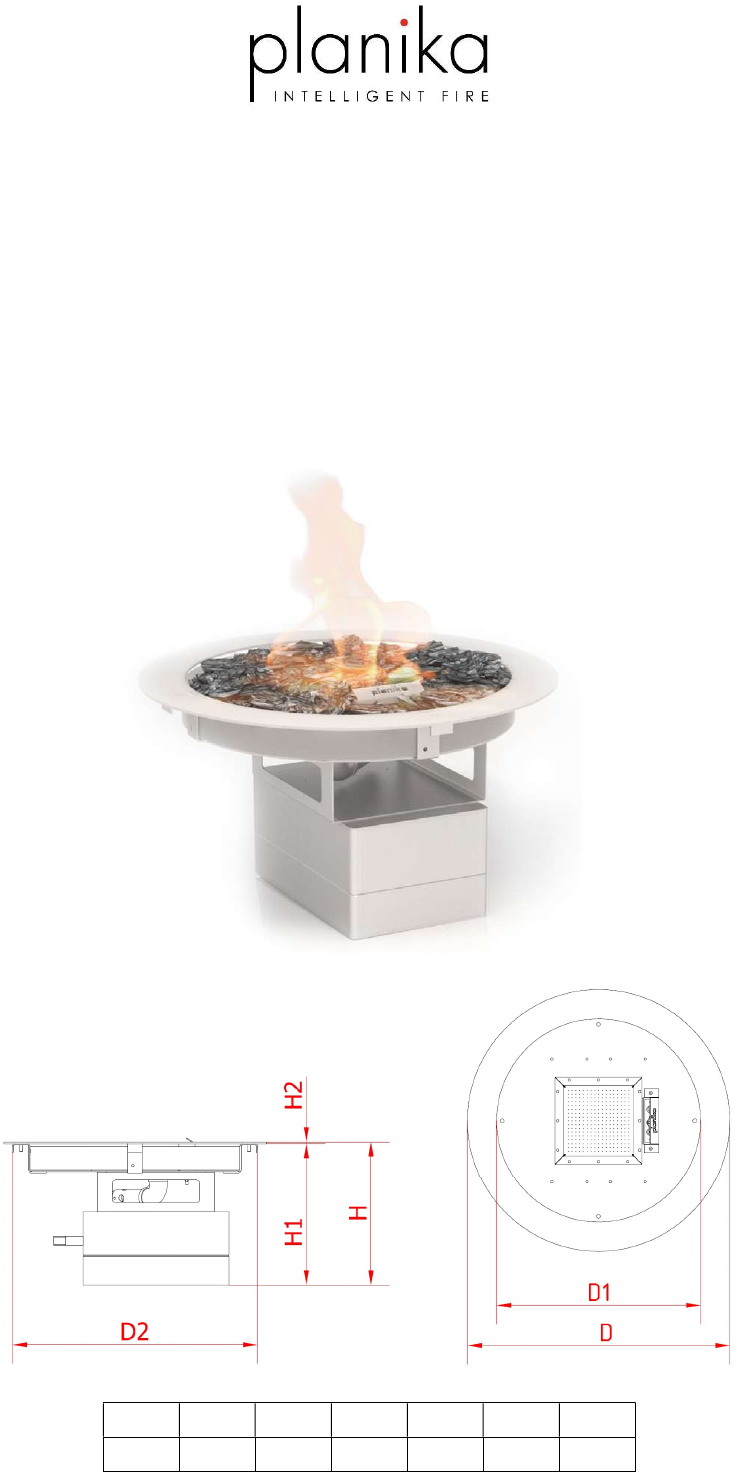 USER’S and INSTALLATION MANUAL GaLiO Fire Pit Insert Natural Gas/Propane-Butane/Propane [mm] Copyright Planika Sp. z o.o. H 250 H1 247 www.planikafires.com H2 3 D 450 IG0031#05 D1 350 D2 420 10.10.