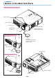 Names of the Main Unit Parts TA TU S N TA S D Y B S TA N D B Y A U TO S O U R C E Applicable Projector: U5-232/U5-132 S Zoom ring [E-26] Focus ring [E-27] Exhaust vents Ventilation slots Remote control sensor [E-13] Adjuster button [E-27] (Also on opposite side) Y B D N TA S TA TU S Applicable Projector: U5-112 B D N TA S Lens S Zoom ring [E-26] Lens cap Remove before use. Attach the lens cap after use to protect the lens.