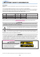 IMPORTANT SAFETY INFORMATION Important Safeguards These safety instructions are to ensure the long life of the unit and to prevent fire and shock. Please read them carefully and heed all warnings. Installation • • • • • • For best results, use the unit in a darkened room. Place the unit on a flat, level surface in a dry area away from dust and moisture. Do not place the unit in direct sunlight, near heaters or heat radiating appliances.