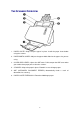 THE SCANNER OVERVIEW 1. PAPER CHUTE—Helps keep the paper in place. Install the paper chute before using the scanner. 2. PAPER WIDTH SLIDER—Adjusts the paper width slider for the paper size you are using. 3. COVER OPEN LEVER—Opens the ADF cover. Pull it to open the ADF cover when you need to clear paper jam or clean the scanner. 4. STACKER—Keeps the paper in place. Extend it in case of longer paper. 5. ADF (AUTOMATIC DOCUMENT FEEDER)—Automatically feeds a stack of documents for scanning. 6.