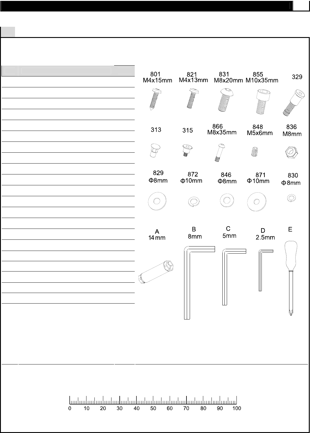 of screws and bolts, use the scale below to measure them and compare them to the sizes listed.