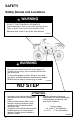 SAFETY Safety Decals and Locations WARNING IMPROPER TIRE PRESSURE OR OVERLOADING can cause loss of control resulting in SEVERE INJURY OR DEATH. TIRE PRESSURE IN PSI (KPa): FRONT 5 (34,5) REAR 5 (34,5) MAXIMUM WEIGHT CAPACITY (Gross Vehicle Weight) INCLUDING MACHINE, DRIVER AND CARGO IS 1200 LBS. (545 kg). Reduce speed and allow greater distance for braking when carrying cargo. Overloading or carrying tall, off-center, or unsecured loads will increase your risk of losing control.
